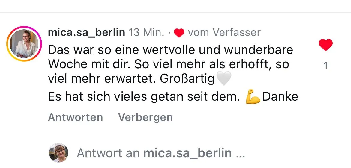 Liebe Maxi, vielen Dank für diesen wundervollen Workshop. Ich kann das, was ich fühle und die positiven Gedanken und Zuversicht, die du in mir ausgelöst hast, garnicht in Worte fassen. (...)